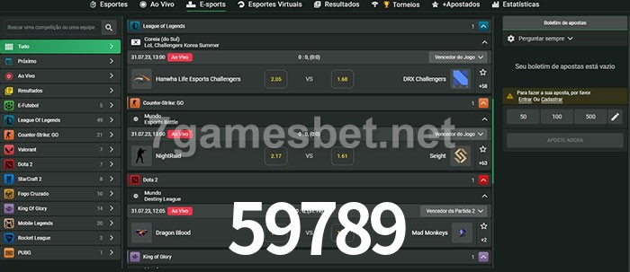 O 59789 oferece uma grande seleção de opções de apostas em e-sports com probabilidades competitivas